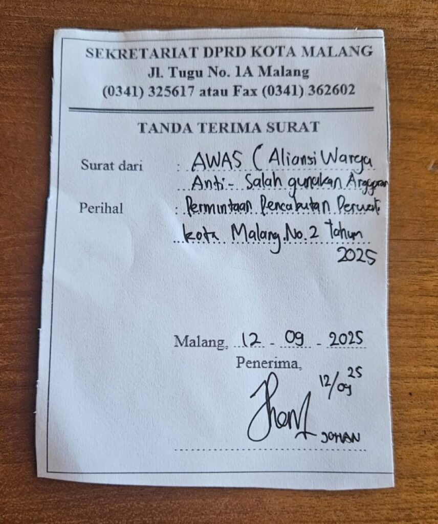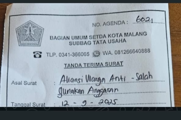 Malang, Mkoran – AWAS ( Aliansi Warga anti Salahguna Anggaran ) Jumat (12/9/2025) siang menepati janjinya untuk MenSomasi Walikota Malang untuk segera Mencabut Perwali No 2 tahun 2025. Dalam somasi tersebut AWAS memberi waktu 5 hari kerja, bila tidak dilakukan maka AWAS akan melakukan upaya hukum yang lebih dari sekarang. Kemudian yang menarik bahwa surat SOMASI tersebut ditembus banyak Instansi, mulai dari Presiden (Pembuat Inpres) kejaksaan agung, KPK, OMBUDSMEN RI, BPK JATIM, serta Ketua DPRD Malang.