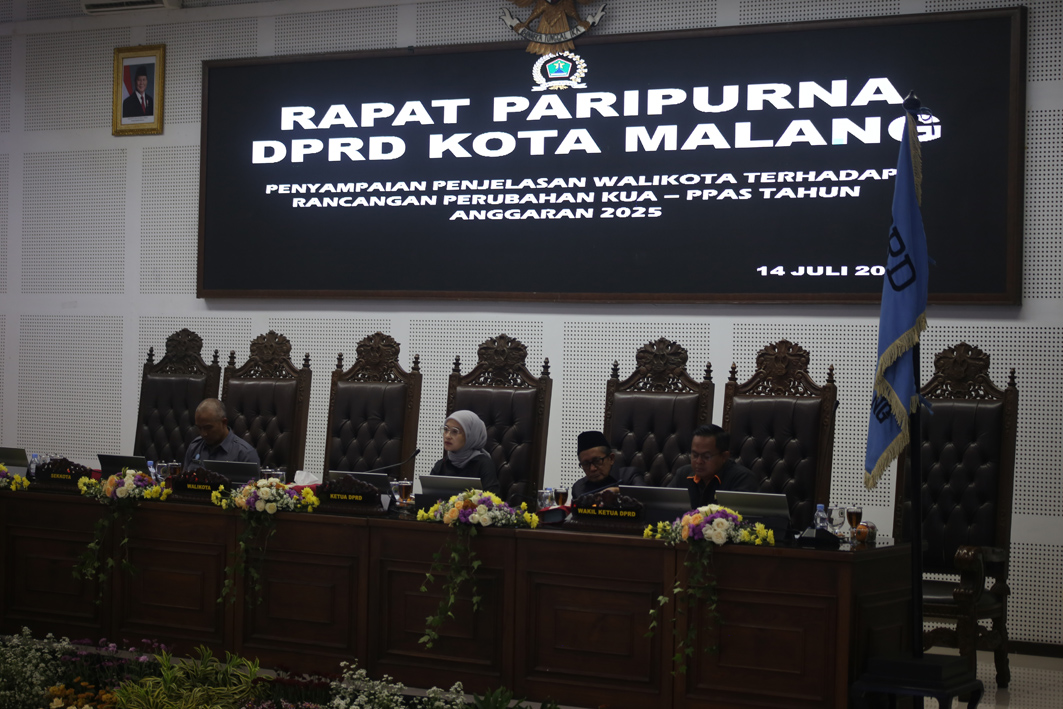 MKoran – Rapat Paripurna Penyampaian Penjelasan Wali Kota atas Rancangan Peraturan Daerah (Ranperda) Kota Malang Pembentukan dan Susunan Perangkat Daerah (PSPD), serta Ranperda Pembangunan Gedung dilaksanakan di Ruang Rapat Paripurna DPRD Kota Malang, Senin (14/7/2025).